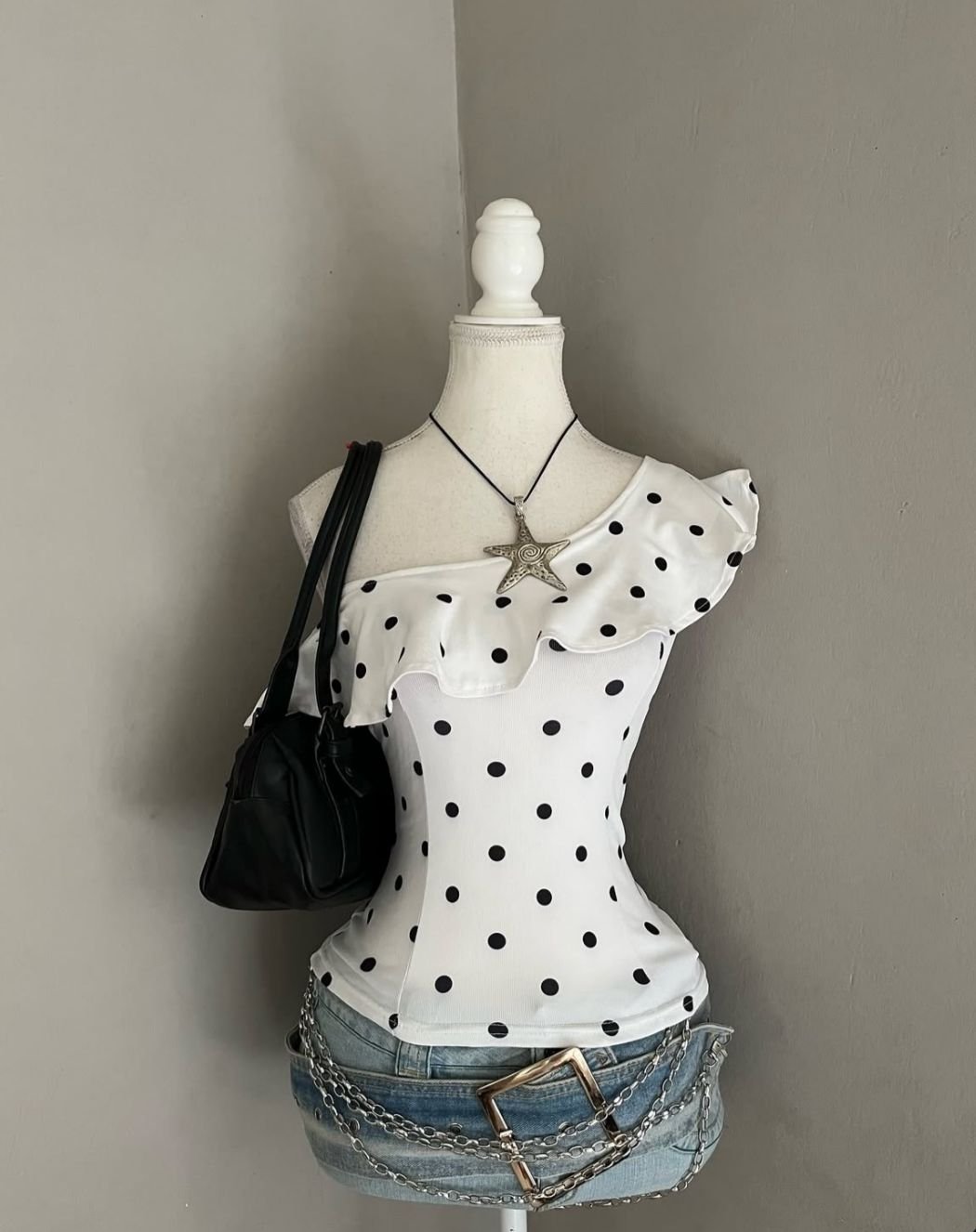 Featuring a sleek one-shoulder neckline and a classic black-and-white polka dot pattern, this top strikes the perfect balance between playful and sophisticated.